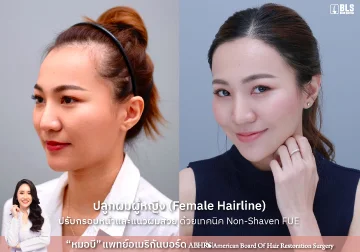 คุณหมอบอกว่าถ้าเรามีปัญหา หน้าผากเถิก รวบผมแล้วไม่มั่นใจ หรือต้องคอยไฮไลท์ไรผมอยู่ตลอดเวลา คุณหมอสามารถแก้ปัญหาด้วยการใช้เทคนิค Female Hairline ปลูกผมผู้หญิง โดยการเจาะย้ายเซลล์รากผมมาปลูกผมตรงบริเวณหน้าผากของเราที่ดูลึก ทำให้หลังจากปลูกผมและผมขึ้นแล้ว กรอบหน้าของเราจะชัดขึ้น ไม่ว่าทำผมทรงอะไรก็จะมั่นใจมากขึ้น