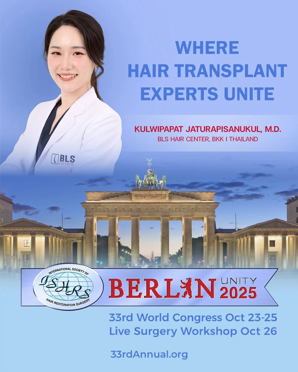 เมื่อวันที่ 23-26 ตุลาคม 2025 ที่ผ่านมา แพทย์ปลูกผมจาก BLS Hair Center 1 ในคลินิกปลูกผมชั้นนำของประเทศไทย เข้าร่วมงานประชุมวิชาการระดับโลก ISHRS World Congress ครั้งที่ 33 (33rd World Congress of the ISHRS Berlin) ณ กรุงเบอร์ลิน ประเทศเยอรมนี ซึ่งเป็นเวทีสำคัญที่สุดสำหรับวงการ Hair Transplant Thailand ที่รวมแพทย์และผู้ที่มีความชำนาญด้านการปลูกผมถาวร (Hair Transplant Surgery Thailand) จากทั่วทุกมุมโลก