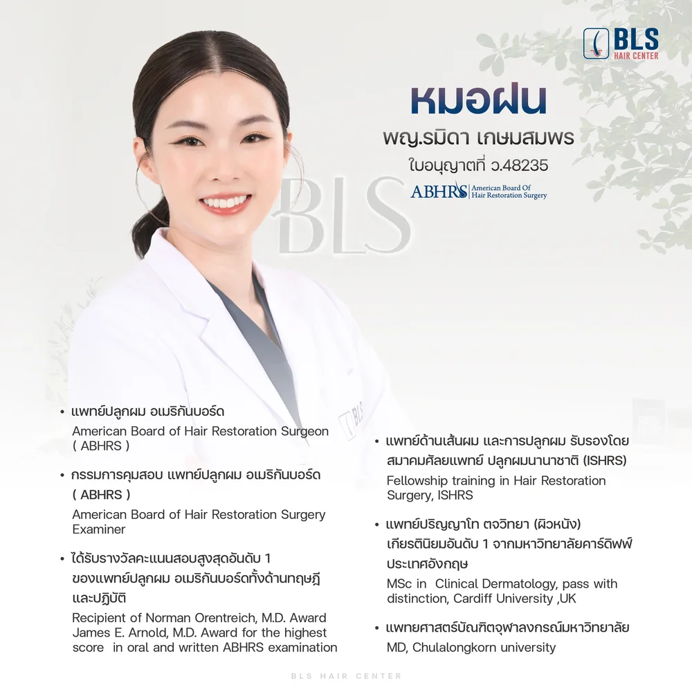 หมอฝนย้ำว่า “หมอและทีม BLS ยึดหลักมาตรฐานของ ABHRS ในทุกขั้นตอนของการดูแลคนไข้ ตั้งแต่การวินิจฉัย การออกแบบแนวผม ไปจนถึงการปลูกผม เพื่อให้ผลลัพธ์ออกมาดีที่สุดและปลอดภัยที่สุดเสมอ”