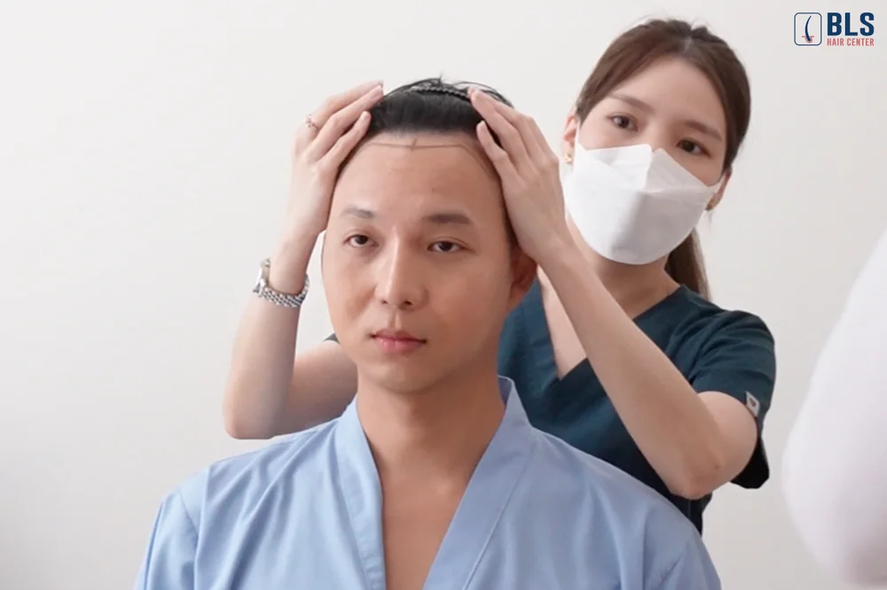 เจ้าหน้าที่จะตรวจร่างกายอย่างละเอียด เช่น วัดความดัน ตรวจชีพจร วัดน้ำหนัก และส่วนสูง พร้อมทบทวนผลตรวจเลือดที่ส่งมาก่อนหน้า เพื่อยืนยันความพร้อมของร่างกายก่อนการปลูกผม